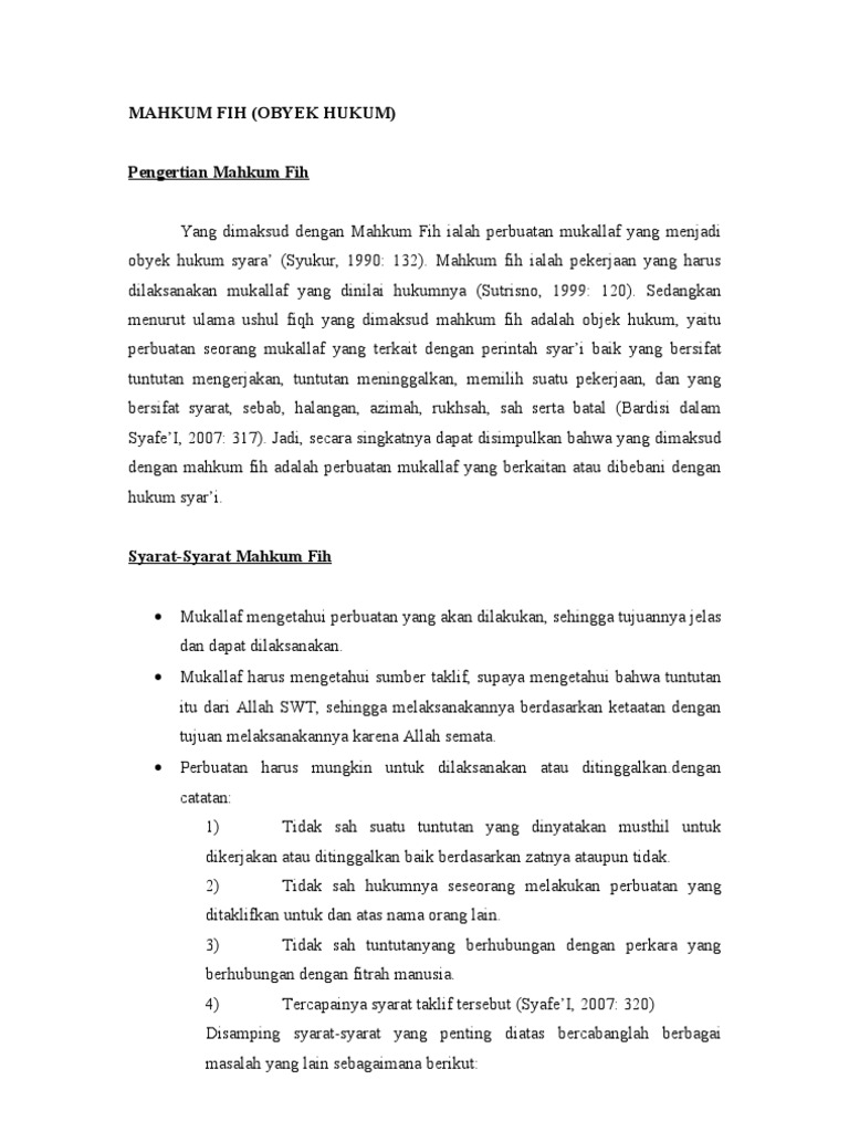 Secara etimologi mahkum fih adalah obyek hukum, artinya suatu perbuatan mukalaf yang berhubungan dengan hukum syari‟. Mahkum alaih ialah seorang mukallaf yang perbuatannya berhubungan dengan hukum syara'. Unsur hukum didalam agama islam ulamaq usul, menyebutkan ada dua macam, mahkum fih dan mahkum alaih. Ulama ushul fiqih telah sepakat bahwa mahkum alaih adalah seseorang yang perbuatannya dikenai khitab allah ta'ala, yang disebut mukallaf. Bab i pendahuluan atas dasar bahwa hukum syara' itu adalah kehendak allah tentang tingkah laku manusia mukallaf, maka dapat dikatakan bahwa pembuat hukum ( lawgiver ) adalah.